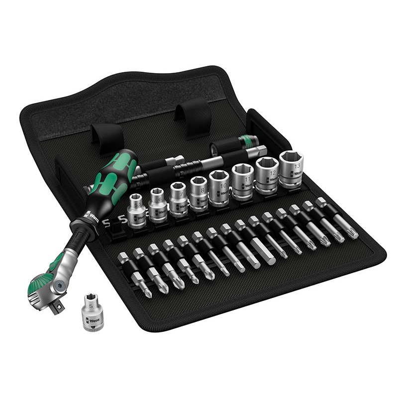 The Wera 8100 SA 6 Zyklop Speed Ratchet Set contains a mixture of 1/4in sockets, extensions, bits and a ratchet. Perfect for a variety of jobs and tasks.