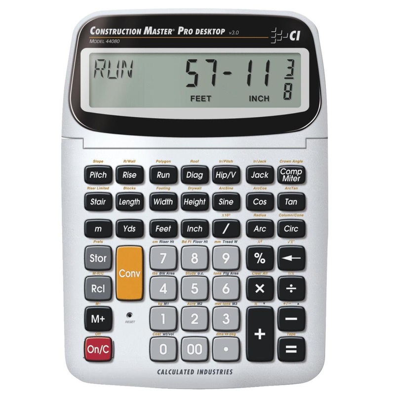 Desktop version. Computes feet, inch, and fraction with trigonomeric functions. Essential tool for serious building professionals, contractors, and architects. Used for projecting, ranging from design and engineering to estimating and bidding. Adds, subtracts, multiplies, and divides in feet and inch fractions, decimal feet, decimal inches, yards, meters, centimeters, millimeters, board feet, square, and cubic dimensions. Converts to and from any dimensional format. 4 built-in memories stores constants or accumulates values in any dimensional format. Authentic solutions for rafters and right angles, hips, valleys, wall studs, concrete square ups, and slopes. Stairway key finds risers, treads, riser height, and tread width. Circles, arcs, and inclines, in addition to many more specific functions. Paperless tape remembers last 20 entries. Boxed.