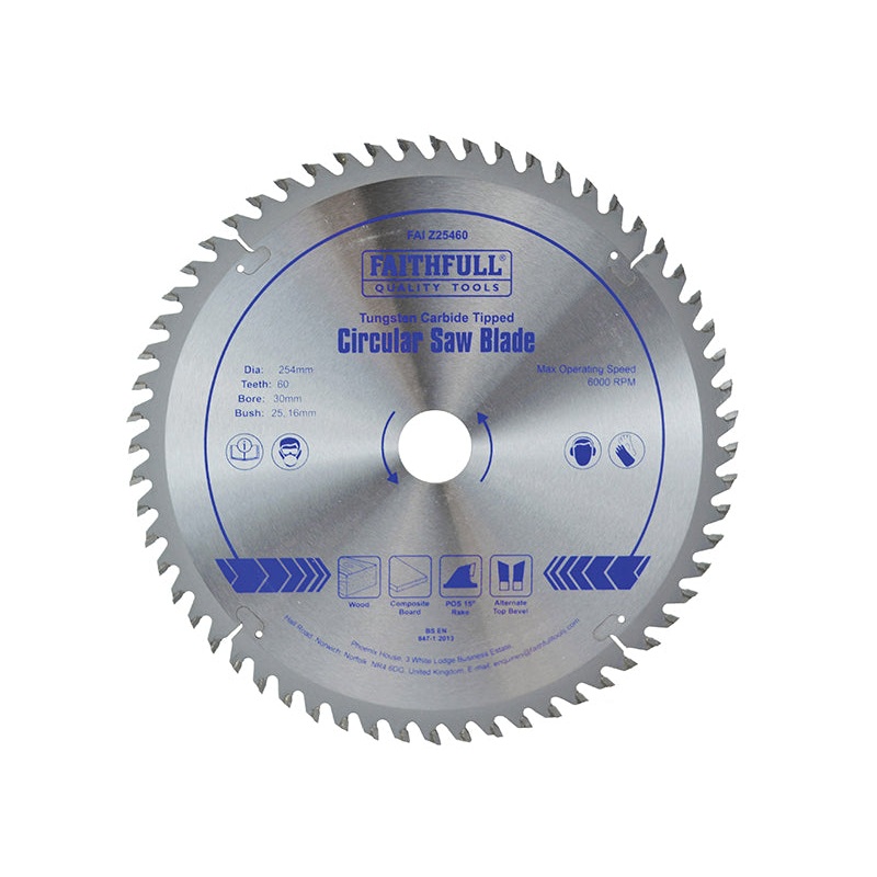 This Faithfull TCT Circular Saw Blade has the following specification: Application: Fine Finish.Blade Diameter: 254mm.Bore: 30mm.Teeth: 60.Bush: 25 & 16mm.Rake: POS.