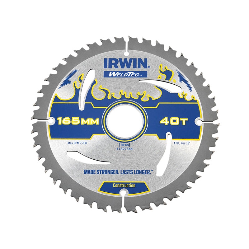 This IRWIN Weldtec Circular Saw Blade has the following specifications: Blade Diameter: 165mm.Bore: 30mm.Teeth: 40.Kerf Thickness: 2.4mm.Tooth Config: ATB.