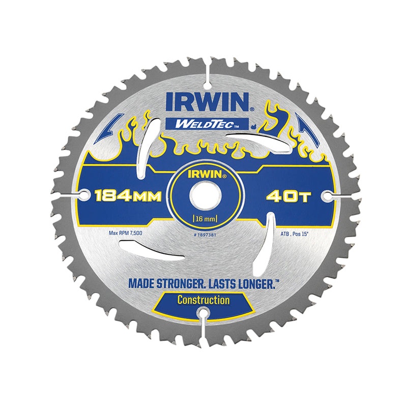 This IRWIN Weldtec Circular Saw Blade has the following specifications: Blade Diameter: 184mm.Bore: 16mm.Teeth: 40.Kerf Thickness: 2.4mm.Tooth Config: ATB.
