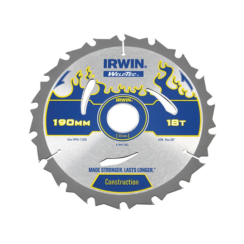 This IRWIN Weldtec Circular Saw Blade has the following specifications: Blade Diameter: 190mm.Bore: 30mm.Teeth: 18.Kerf Thickness: 2.4mm.Tooth Config: ATB.
