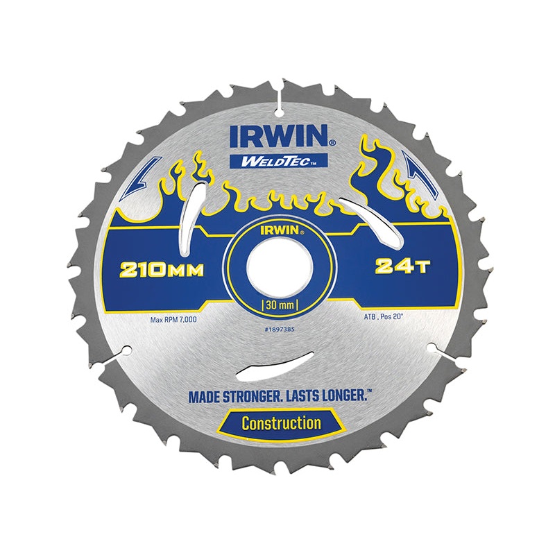 This IRWIN Weldtec Circular Saw Blade has the following specifications: Blade Diameter: 210mm.Bore: 30mm.Teeth: 24.Kerf Thickness: 2.4mm.Tooth Config: ATB.